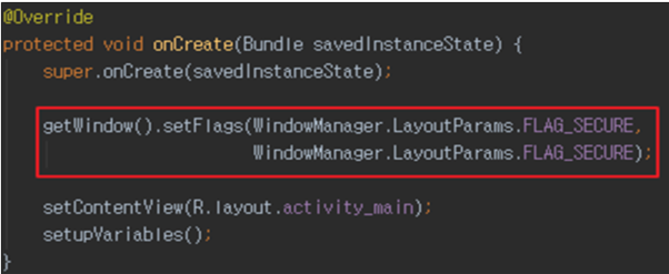 * 실행 중인 앱의 스냅샷 파일이 노출되지 않도록 FLAG_SECURE 상수 설정
