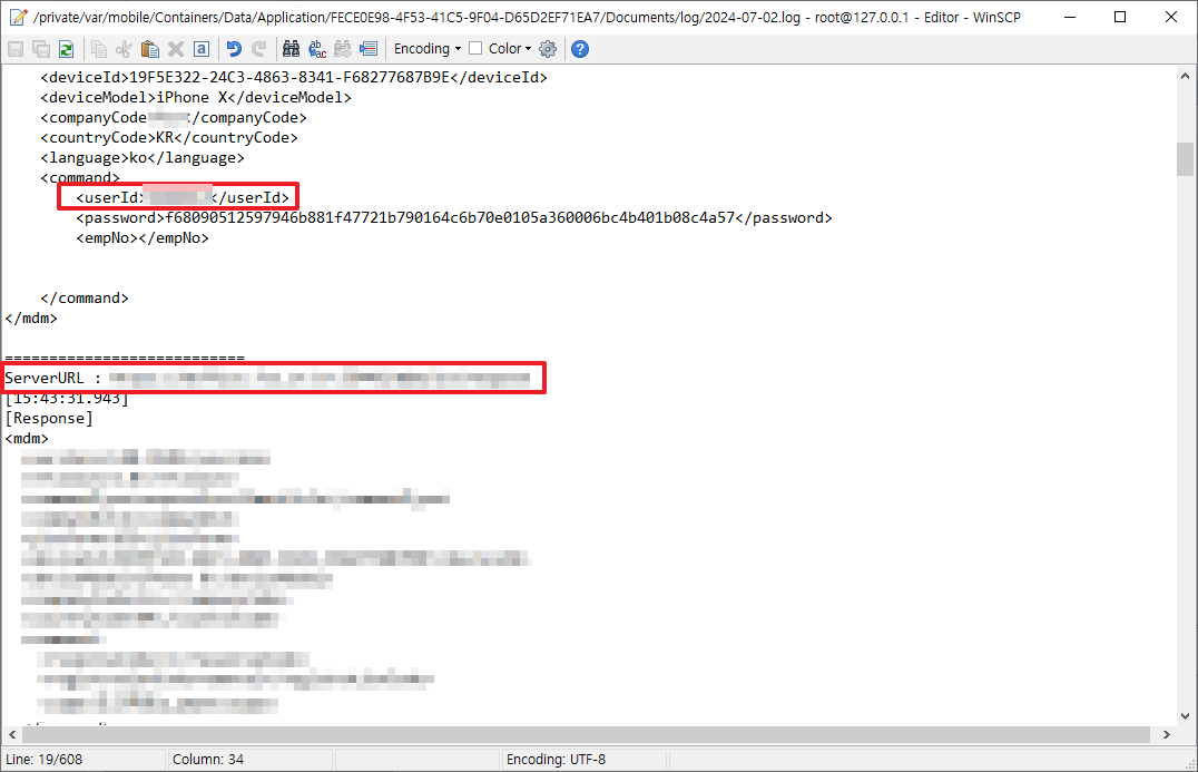 진단을 위해 내부 경로를 탐색하던 중 Documents 경로에 한 log 파일을 확인할 수 있었는데 해당 log 파일 내부에는 UserID 값과 암호화된 Password, 내부 서버 URL 등이 노출된 것을 확인할 수 있었다.