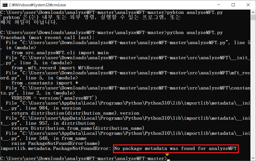 이게 뭔가 싶어 구글에 바로 때려봤는데 analyzeMFT 관련해서 이런 에러 정보를 가진 글은 없었다... 나만 발생하는 건가?