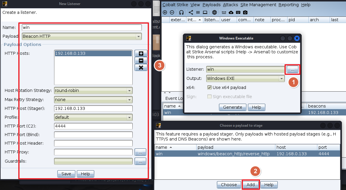 윈도우 환경을 타깃으로 공격한다고 가정해서 메뉴 Payloads - Windows Stager Payload를 클릭하면 Windows 악성 코드를 생성하는 창이 뜬다. 여기서 리스너 옆의 ... 클릭, Add 버튼을 누르고 아래와 같이 리스너를 생성했다.